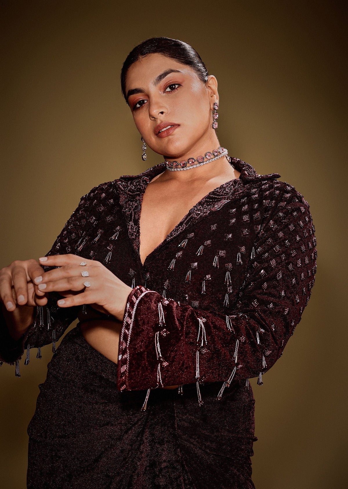Embroidered Wine Velvet Blazer Blouse With Tassels And Draped Skirt