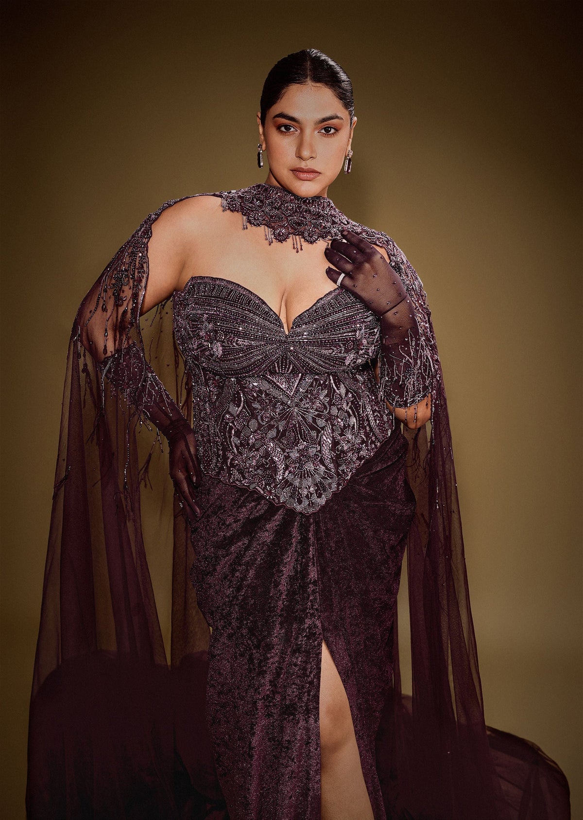 Wine Velvet Corset Set With Drape Skirt And Embroidered Cape - US 0